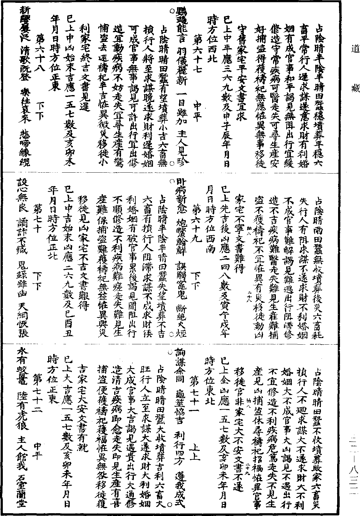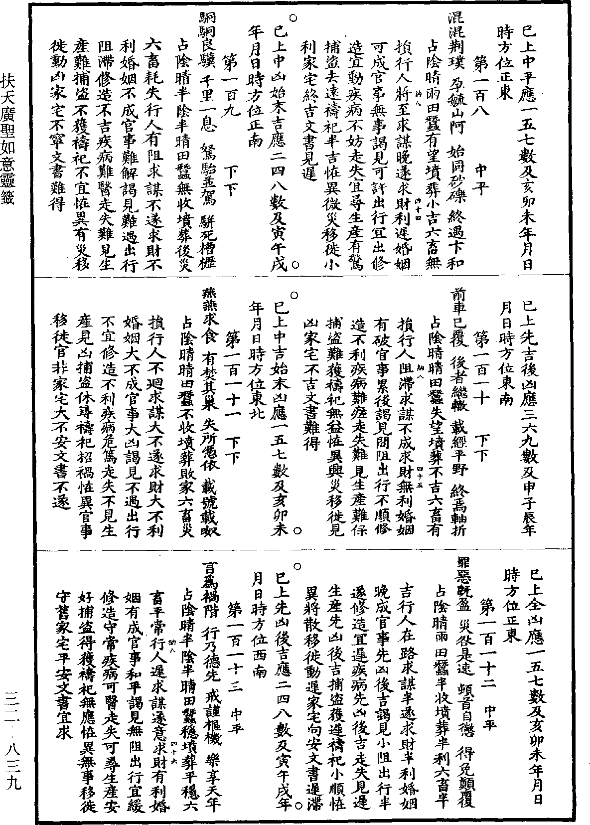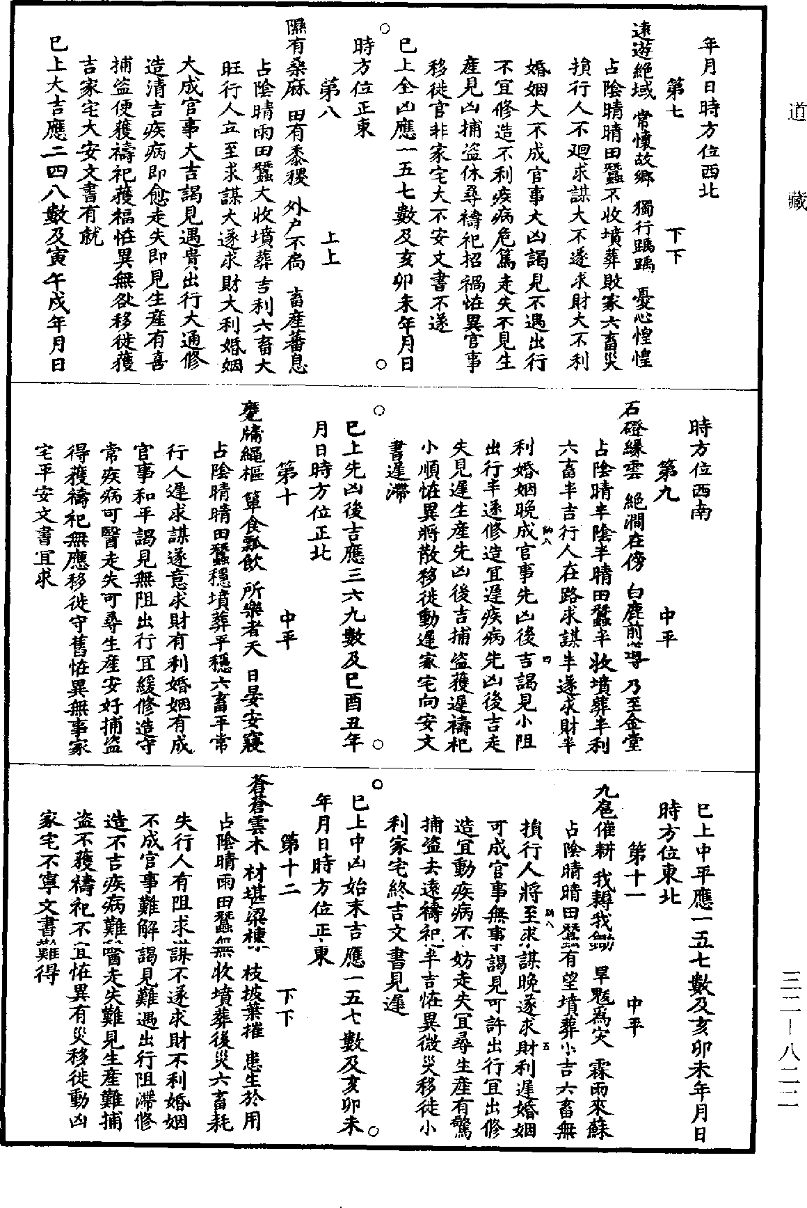 占阴晴,晴。田蚕半收,坟葬半利。六畜半吉,行人在路。求谋半遂。求财半利。婚姻晚成,官事先凶后吉。谒见小阻,出行半遂,修造宜迟,疾病先凶后吉。走失见迟,生产先凶后吉,捕盗获迟,祷祀小顺。怪异将散,移徒动迟,家宅向安,文书迟滞。
