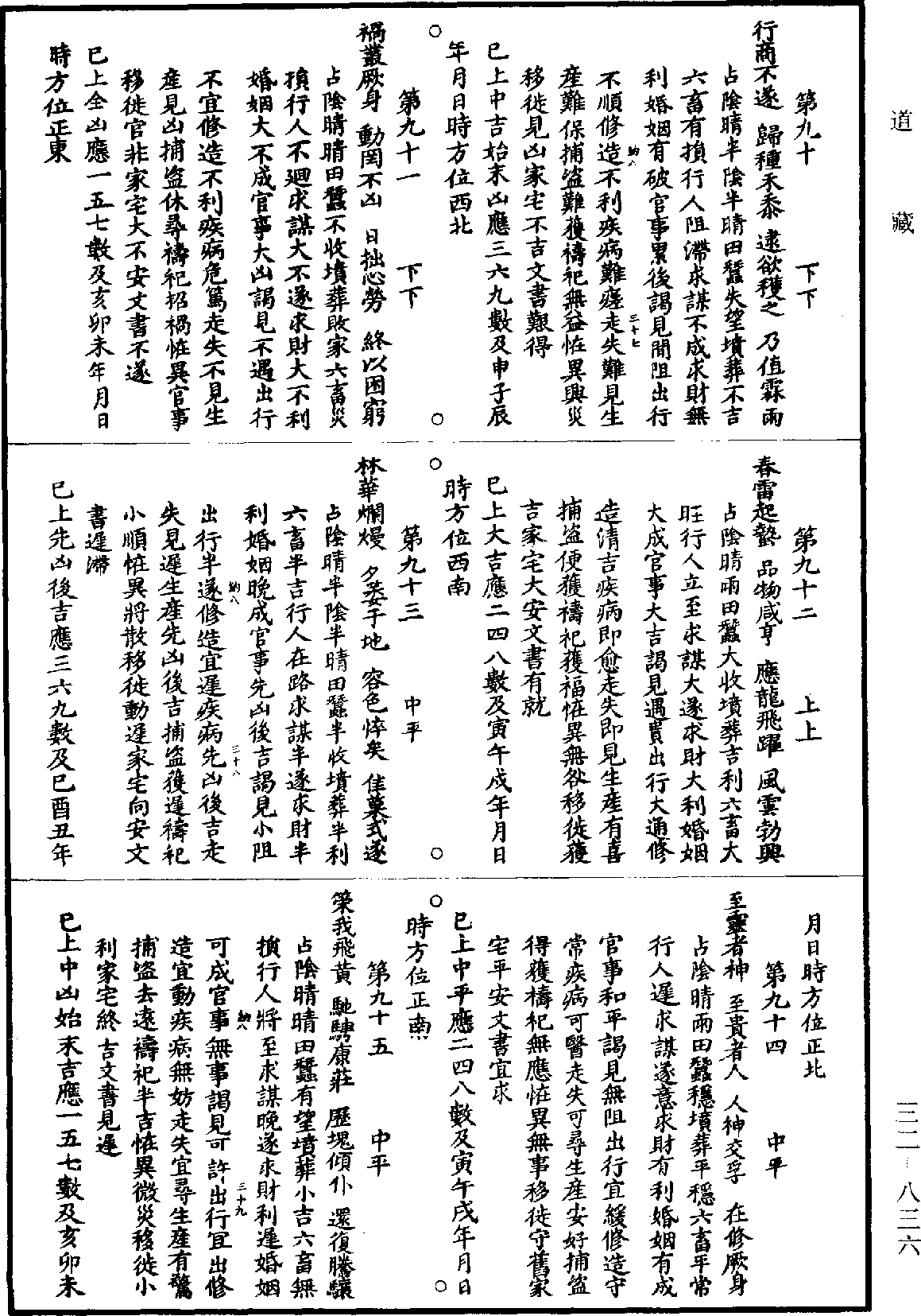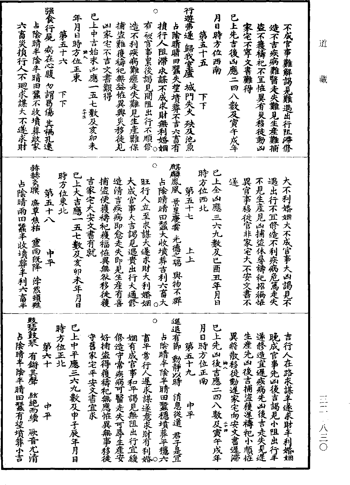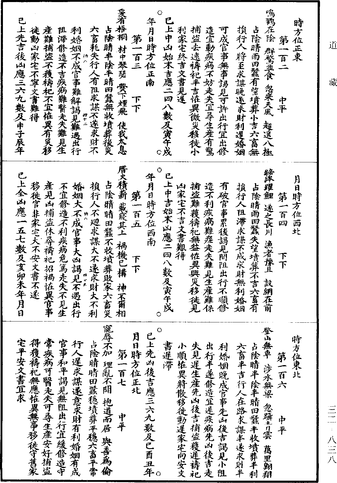 占阴晴,晴。田蚕半收,坟葬半利。六畜半吉,行人在路。求谋半遂。求财半利。婚姻晚成,官事先凶后吉。谒见小阻,出行半遂,修造宜迟,疾病先凶后吉。走失见迟,生产先凶后吉,捕盗获迟,祷祀小顺。怪异将散,移徒动迟,家宅向安,文书迟滞。