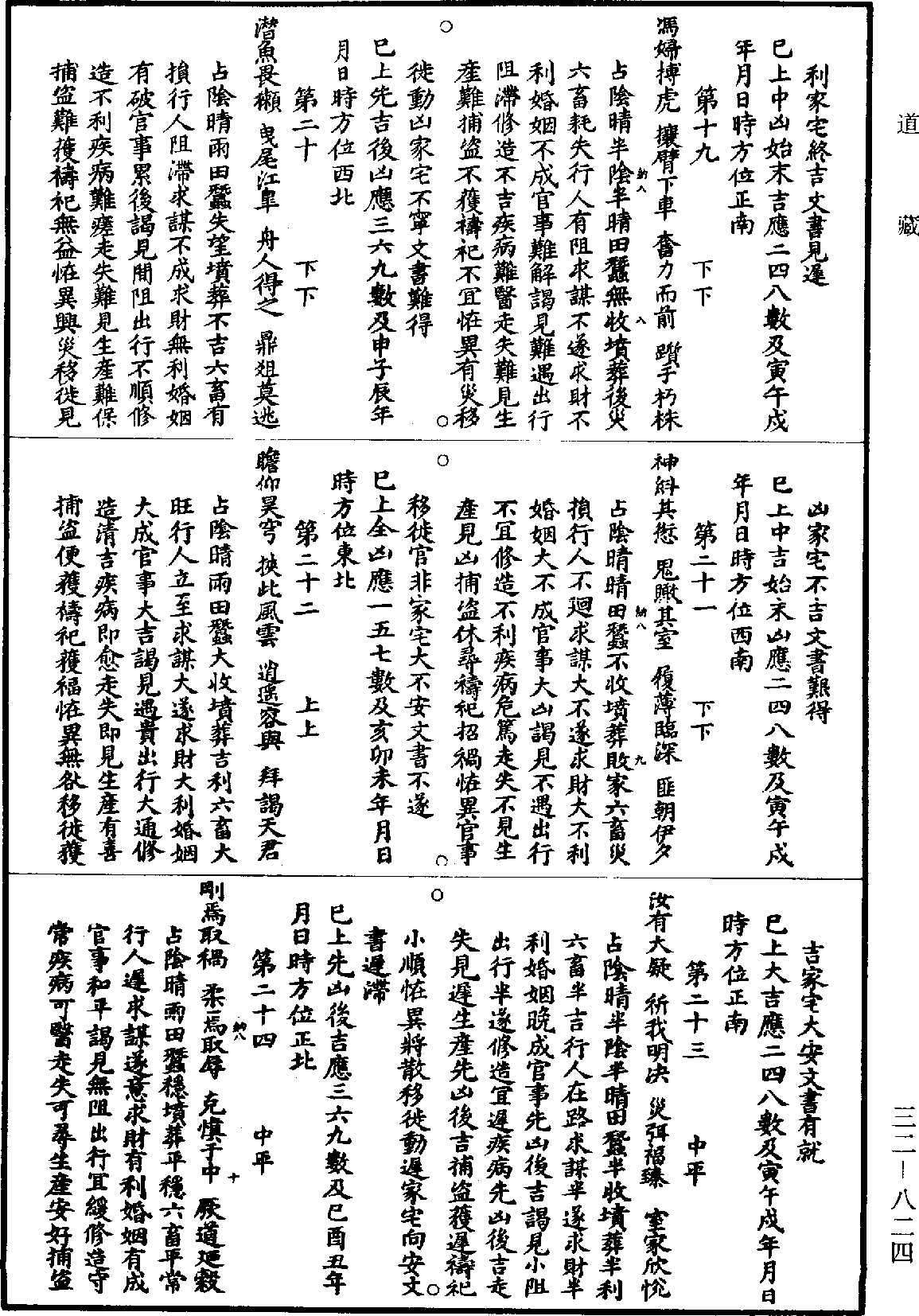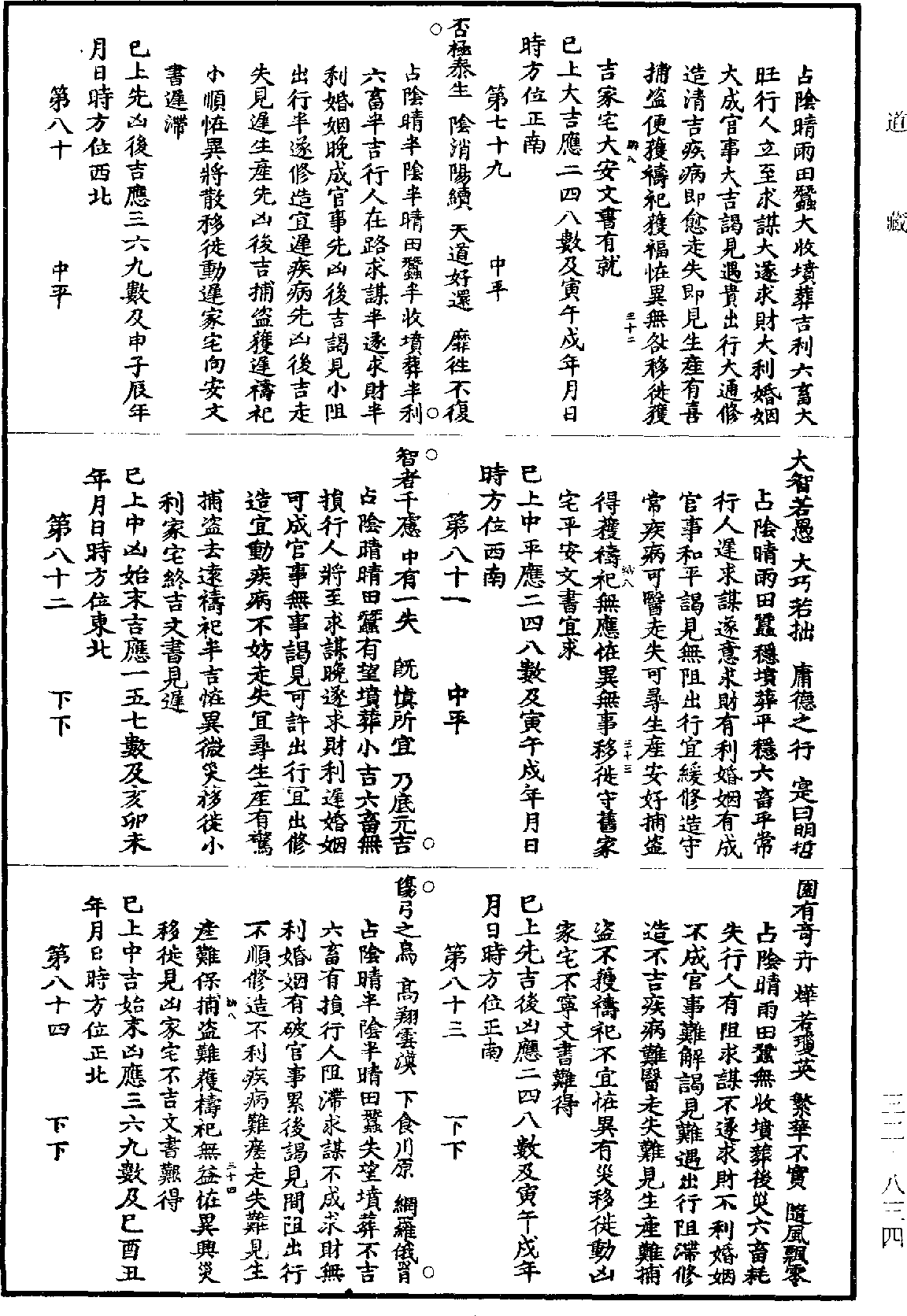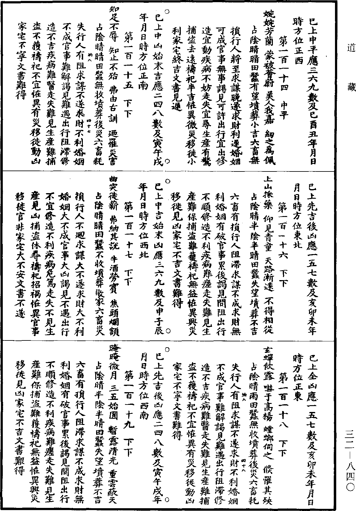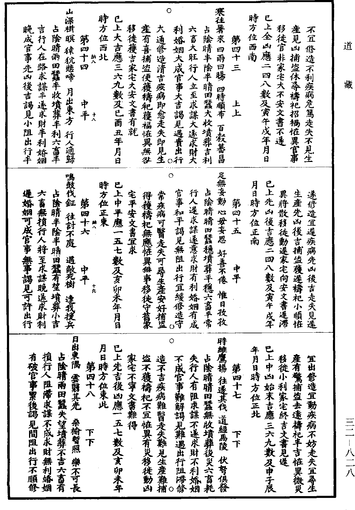 占阴晴,半阴半晴。田蚕失望,坟葬不吉。六畜有损,行人阻滞。求谋不成,求财无利。婚姻有破,官事累后。谒见问阻,出行不顺。修造不利,疾病难痉。走失难见,生产难保。捕盗难获,祷祀无益。怪异兴灾,徒见凶。家宅不吉,文书艰得。