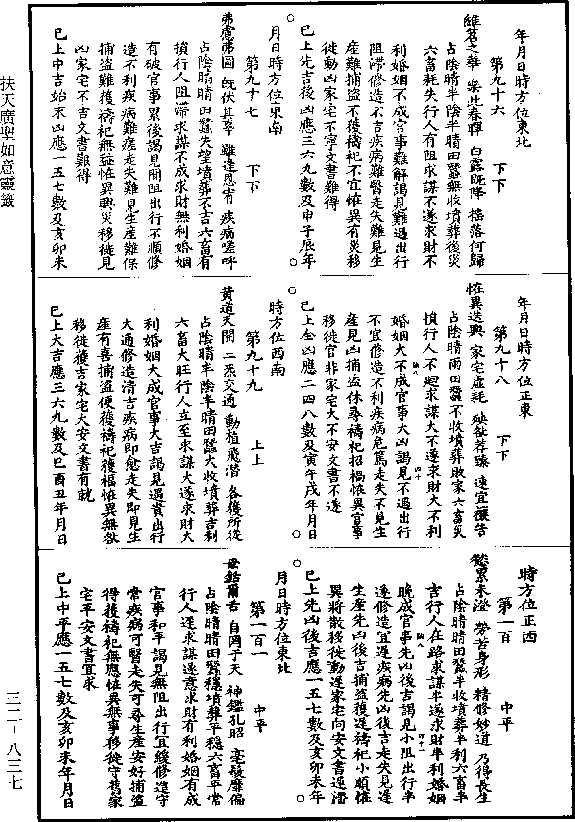 占阴晴,晴。田蚕大收,坟葬吉利。六畜大旺,行人立至。求谋大遂,求财大利,婚姻大成,官事大吉。谒见遇贵,出行大通。修造清吉,疾病即愈。走失即见,生产有喜。捕盗便获,祷祀获福。怪异无咎,移徒获吉。家宅大安,文书有就。