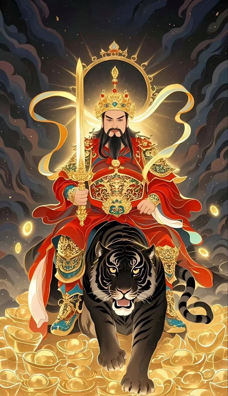 驱邪辟祟,守护财富:人们相信,财富需要强大的力量来守护,以免遭邪祟和小人窥窃。赵公明威猛的形象正能起到镇宅辟邪、保护家财的作用。他能赶走一切不祥,为财富创造一个安全的环境。
